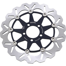 Disque de frein flottant rondPoids réduit des masses non suspendues. Puissance de freinage accrue. Meilleure dissipation de la chaleur. Excellente résistance à la corrosion. Moins de risque de déformation. Maintient plus propre la surface de contact plaquette-disque. Améliore et personnalise l’esthétique de la moto. Support en aluminium haute résistance anodisé ou chromé (7075 T6 – 6082 T6) ou en acier inoxydable (AISI 420). Disque de frein flottant rond
