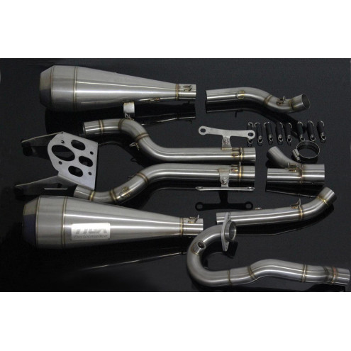 Le silencieux est en acier inoxydable avec un embout de sortie en fibre de carbone, l'embase en aluminium est taillé dans la masse sur machine CNC pour une finition de haute qualité et un gain de poids, ce système augmente les performances et améliore le look de la moto.