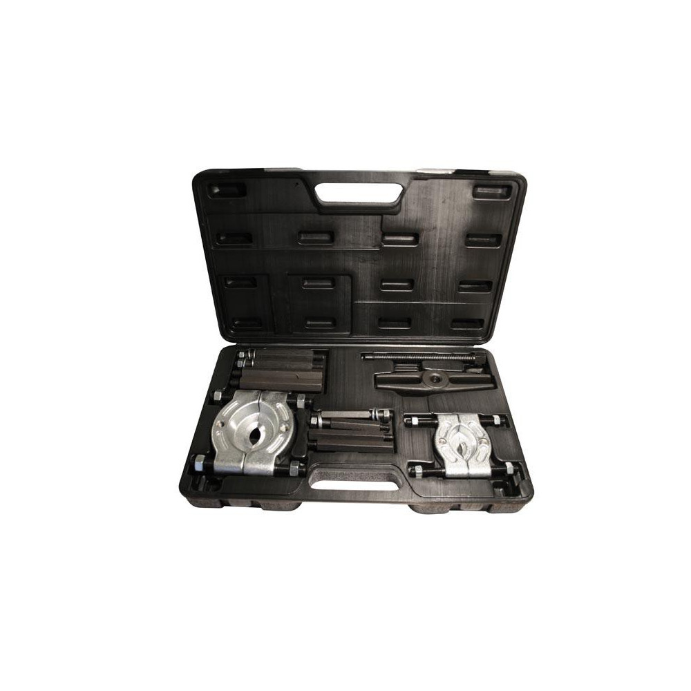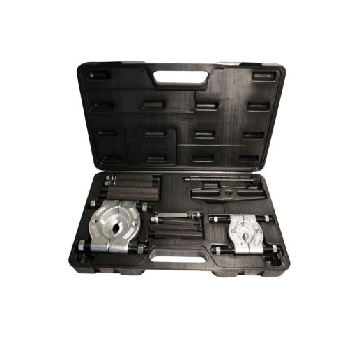 Coffret d’extracteurs de roulement composé de 2 décolleurs à guillotine pour décoller le roulement et d’un extracteur à vis pour sortir le roulement.