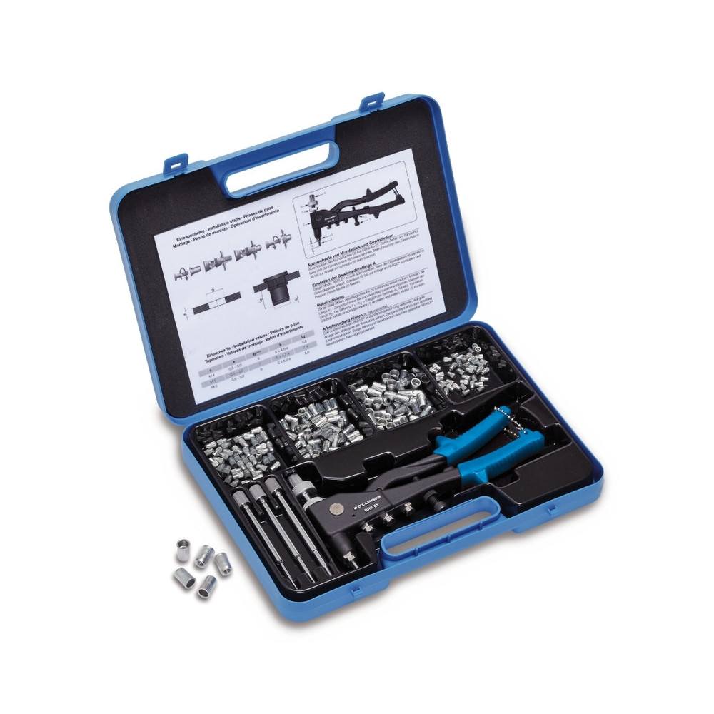 Coffret pince à écrous noyés avec accessoires et assortiment d’écrous noyés acier (environ 60 rivets).